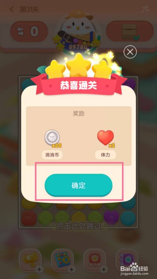 若是达到方针就弹出恭喜通关的提醒点击【确定】按钮。