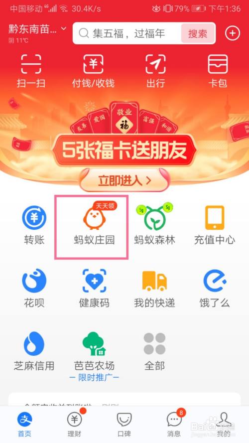 进入支付宝的页面点击【蚂蚁庄园】进口