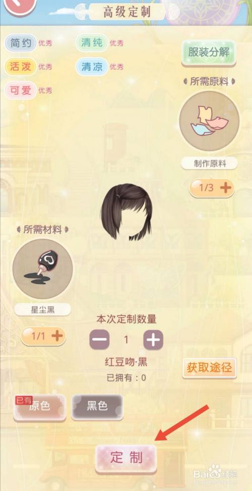 工具/原料华为Android10古迹暖暖方式/步骤1点击设计工坊。2点击高级定制。3点击头发一栏,找到红豆吻。4选择黑色,点击黑色染料下的加号。5利用星光币兑换黑色染料。6回到高级定制界面,点击定制。7获得黑色红豆吻发型。END