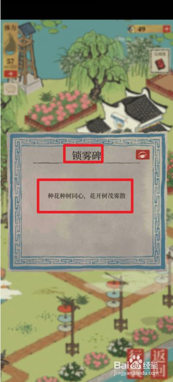 工具/原料华为nova6EMUI11.0.0江南百景图1.4.0清里枯枝和杂草1点击园中的【锁雾碑】之一。2查看锁雾碑上的提醒:不见枯枝不见草,满园鲜花雾退散。意思是清理枯枝与杂草。3清理园中的【枯枝】,一个也不克不及漏失落。4清理【杂草】。END莳花种齐心树1点击锁雾碑之二。2查看锁雾碑上的提醒:莳花种树齐心 花开树茂雾散。技巧是莳花种树。3地图上的地盘上莳植齐心树田,材料在院子里找。4再把两个花盆种按要求种满花。END注重事项小小提醒,清理枯枝时必然要 细心一点,漏失落一个也驱散不完全。 种树莳花,要记得种上齐心树田,园子里的两个花盆也要种满花。