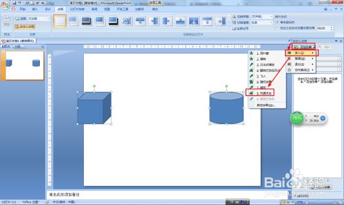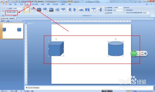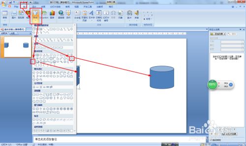 在PPT2007中点击插入——外形——别离选择立方体和圆柱体插入,放置在编纂的摆布双方。