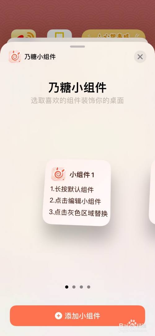 保留组件或壁纸到手机当地,回到手机桌面,长按空白处,点击页面顶部的“+”号,找到乃糖小组件,添加默认组件到手机桌面