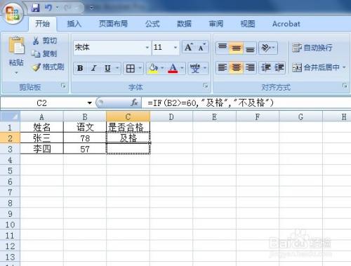 接下来进行设置,在C2单位格中输入公式“=IF(B2>=60,“合格”,"不合格")”,该公式现实为判定语句,若是B2单位格中的数据大于等于60,即鉴定为合格,不然不合格。