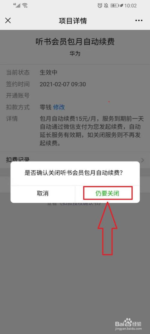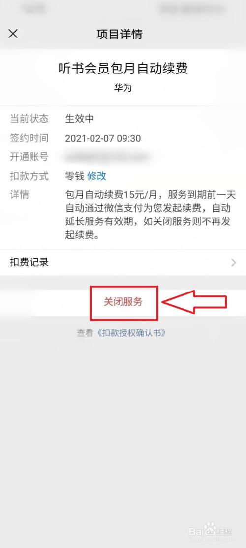●找到华为听书会员包月主动续费,然后点击【封闭办事】。