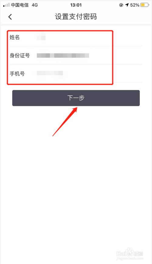5、进入到设置支付密码页面里,输入【身份证号码】,点击【下一步】;