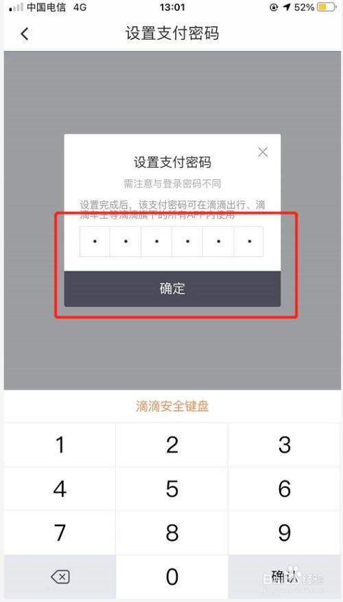 手机验证经由过程之后,最后输入新的支付密码,点击【确定】即可当作功在滴滴顺风车app设置支付密码了,如下图。