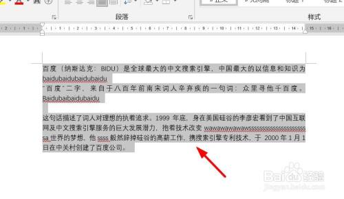 若要西文或者单词从中心断开,则操作如下:选中整个文字段落。