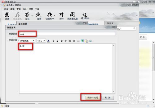 在“新建签名”的窗口里,“签名名称”里输入肆意文字,“签名内容”里输入“发信人签名”。再点击“保留并封闭”按钮。