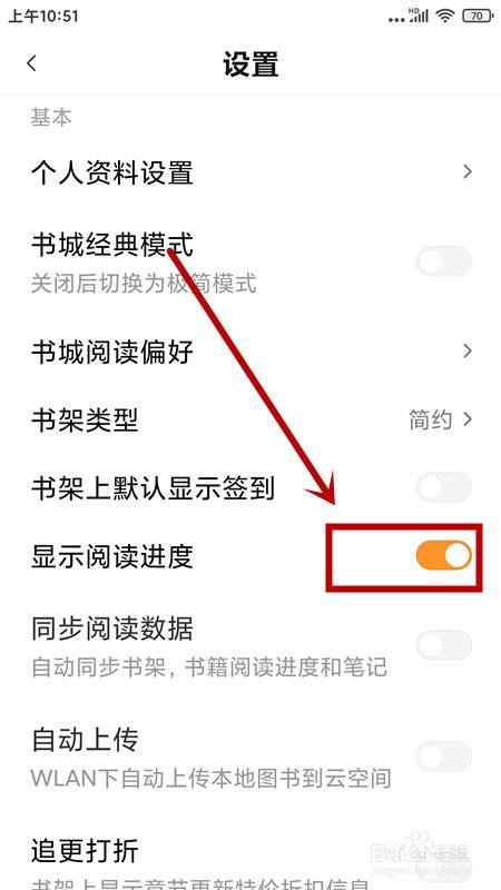 点击【显示阅读进度】选项后面的功能开关,即可让APP显示阅读进度