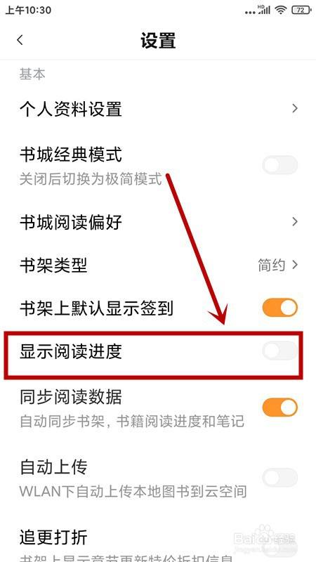 在【设置】页面,找到【显示阅读进度】选项。可以看到,该选项功能没有打开
