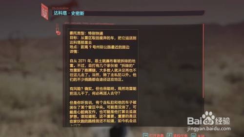 工具/原料神舟笔记本电脑Z7M-CU5NBWindows 10赛博朋克2077 1.11方式/步骤1使命位置如图,在东边的荒原里。2到位置接听达科塔的德律风即可触发使命。3注重周围有良多地雷和无人机需要先破解失落。4然后调查中心树下的尸身。5最后上车把车开达到科塔的车库即可完当作使命。END