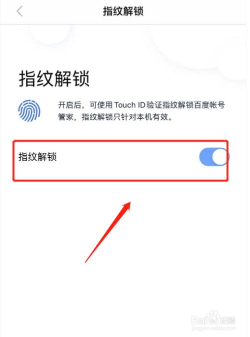 最后,经由过程指纹验证,即可在百度账号管家中,开启指纹解锁登录功能了,如下图。