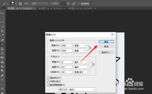 按照本身的需要从头输入数值,例如高度宽度,分辩率,以及约束比例是否采用。