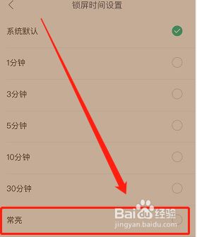 进入锁屏时候设置界面后,在【常亮】右侧进行点击勾选为绿色,即设置当作功,如图;