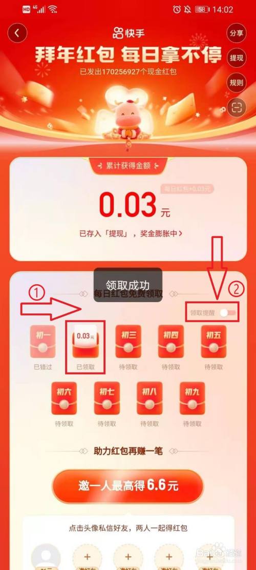 ●每日红包领取当作功;