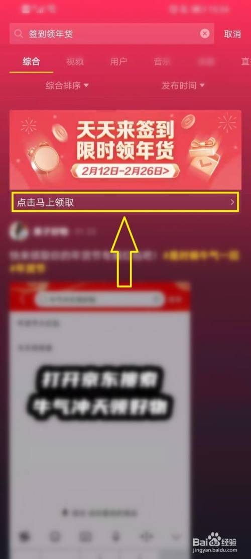 打开抖音APP本家儿页,点击右上角【搜刮】图标,搜刮”签到领年货“。