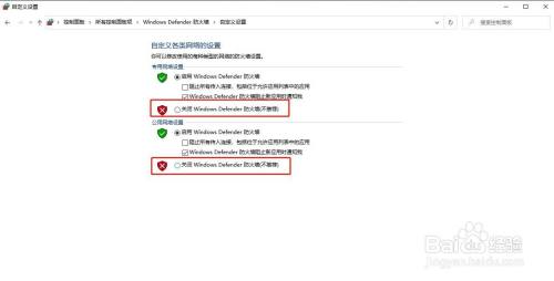 在自界说设置窗口,勾选封闭windows defender防火墙