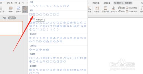 WPS演示中建造圆弧形三角形,选择圆角矩形,如图所示。
