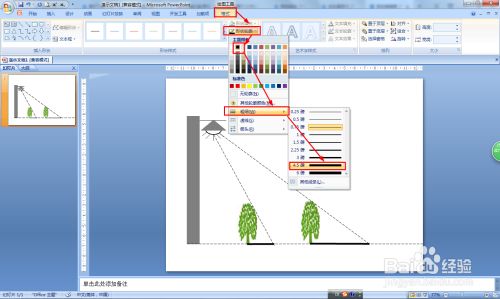 最后选择方才画的直线——点击格局——外形轮廓——颜色设置为黑色,粗细设置为4.5磅,这样就画好影子了。