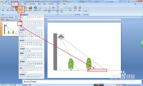 点击插入——外形——选择直线,从路灯与树之间画一条切线,设置切线为虚线。