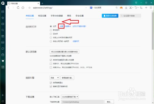 找到“启动时打开”栏,点击本家儿页旁边的【设置】。
