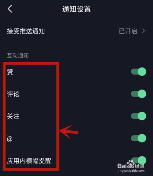 选择【互动通知】,并封闭【赞】、【评论】、【存眷】、【@】、【应用内横幅提醒】即可封闭所有互动动静。