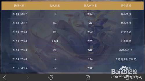 工具/原料三星Galaxy C9 ProAndroid 8.0.0王者荣耀(最新版)方式/步骤1我们在手机上打开王者荣耀。2点击右下角的“背包”。3点击“利用记实”。4点击下方的“铭文碎片”。5即可看到铭文一周内的变更明细和残剩环境了。END注重事项但愿此篇经验可以或许对您有帮忙哦!
