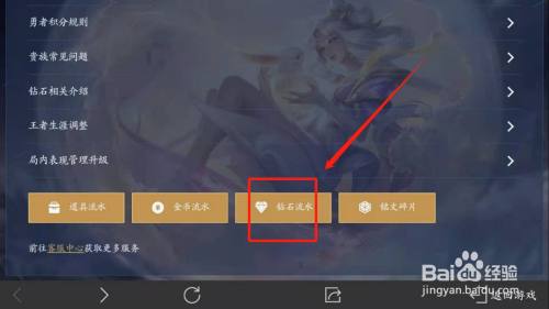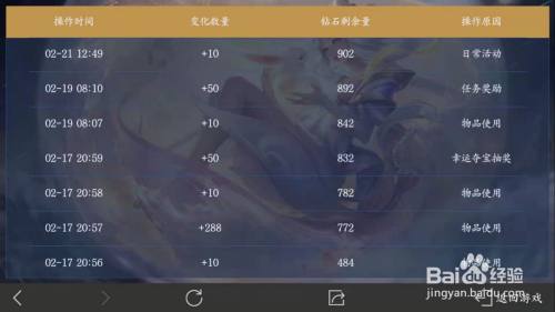 工具/原料三星Galaxy C9 ProAndroid 8.0.0王者荣耀(最新版)方式/步骤1在手机上打开王者荣耀最新版。2点击右下角的“背包”。3在背包中,点击上方的“利用记实”。4点击“钻石流水”。5即可看见钻石近一周的增减变更已经残剩数目了。END注重事项但愿此篇经验可以或许对您有帮忙哦!