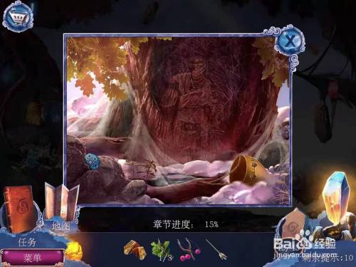 对面的大树下在枯枝里面找到制烟器部件1,树干上描绘的是佩伦的画像,用坏了的箭取下左边夹住的雪花锁。