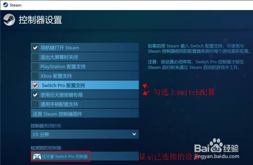 3.打开steam平台节制器查看手柄是否毗连,调节switch设置装备摆设。