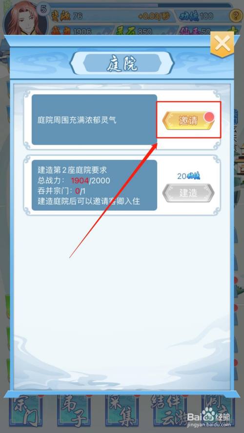 工具/原料品牌型号:iPhone 7 Plus系统版本:iOS 14.4软件版本:掌门来修仙 1.31.打开掌门来修仙1在手机桌面中,点击“掌门来修仙”APP图标。2在“掌门来修仙”本家儿界面中,点击下方的“天井”按钮。END2.邀请客卿入住天井1在“天井”界面中,点击“邀请”按钮。2在“邀请”界面中,选摘要邀请的客卿,点击下方的“邀请”按钮。3返回到“天井”界面后,显示客卿信息即可。END