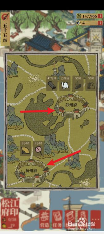 打开江南百景图游戏,进入松江府,想要赚钱首先要会操纵其他三个城市的资本。