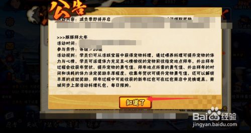 工具/原料手机系统:IOS14.3游戏:火影忍者方式/步骤1打开游戏,如图所示点击进入【豚豚拜大年】活动。2如图所示点击【知道了】封闭活动申明3如图所示点击【外出贺年】4如图所示点击选择【贺年地址】5如图所示获得贺年红包后在红包商铺兑换奖励END注重事项获得贺年红包后在红包商铺兑换奖励