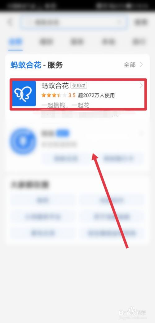 进入到支付宝首页后,再点击顶部的搜索框,进入搜刮页面,点击搜刮“蚂蚁合花”;