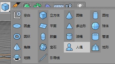 2.菜单栏下面找到立方体图标,长按立方体图标,在弹出的子列表中选择人偶