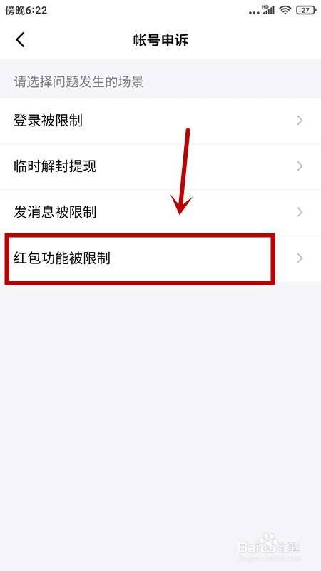 在【惩罚申诉】页面,找到并点击【红包功能被限制】选项
