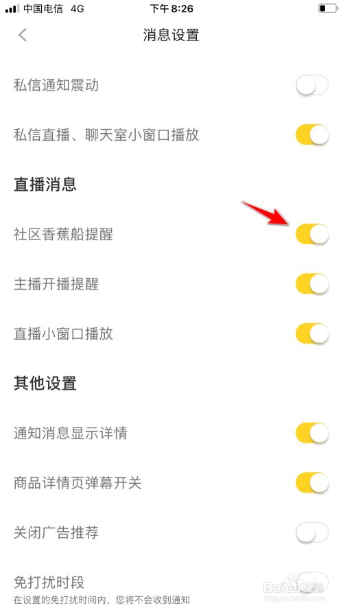 进入动静设置后,点击社区喷鼻蕉船提醒的选项后方的开关。