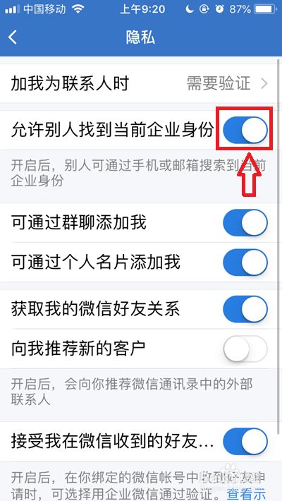 将【许可别人找到当前企业身份】右侧的开关按钮点击封闭