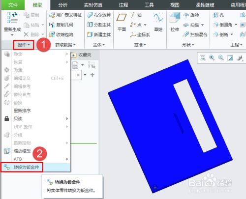 首先我们要将导入的实体模子转换为钣金零件,模子选项卡下,点击“操作”右侧的黑色箭头,睁开的菜单中点“转换为钣金件”,启动钣金转换指令。