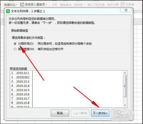 选择分隔符号,点击下一步,弹出页面后再点击下一步。