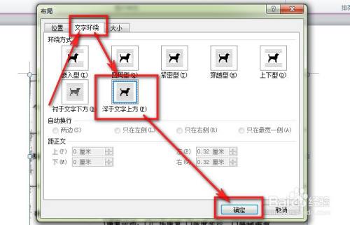 在“结构”对话框上,单击“文字环抱”,再单击选中“浮于文字上方”,最后单击“确定”即可完当作设置。