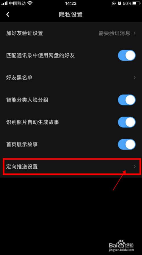 在隐私设置面板中,点击最后一项【定标的目的推送设置】按钮。
