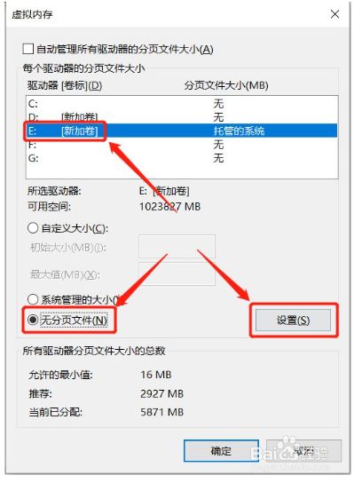 稍后在弹出的菜单平分别点击“E:”、“无分页文件”、“设置”。