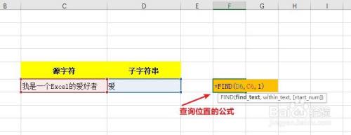 在选择的单位格中输入“=FIND(D6,C6,1)”公式。