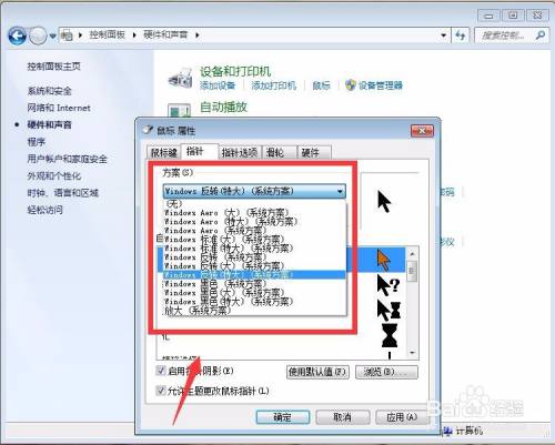 点击方案栏下面的小三角,可以选择良多分歧的鼠标指针方案,大师可以按照爱好选择一下,结果图即页面右侧所示。