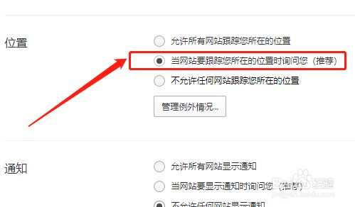最后,在“位置”下,点击选择“当网站要跟踪您地点的位置时扣问您”选项即可。如图: