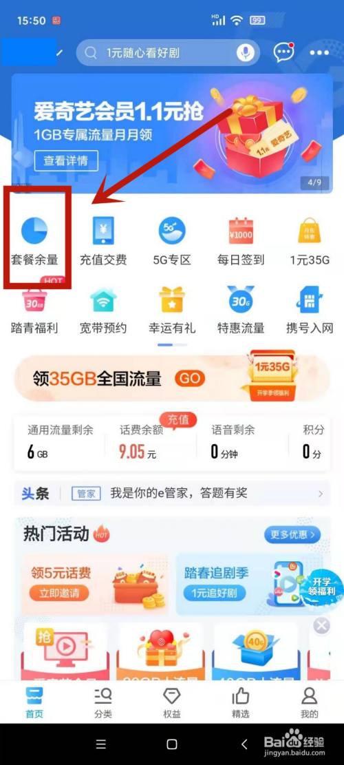 END1.打开中国移动,点击套餐余量。