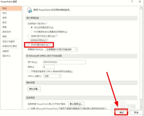 在【PowerPoint选项】对话框,找到【常规】选项卡下的【主动折叠功能区】,可以看到该选项未被勾选