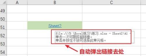 将鼠标移入单位格B51区域,鼠标主动变更手形,并显示链接目标地,点击后主动跳转到Sheet2的A1单位格。
