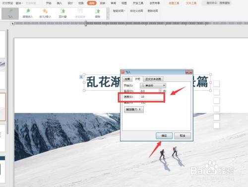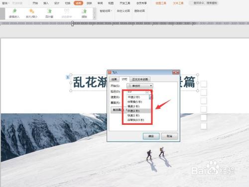 点击功能区自界说动画,在右侧打开一个面板,在速度这里可以选择。